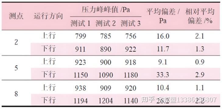 1)在重复性测试验证中,上下行时测点2、5、8的压力峰峰值的相对平均偏差分别为2.1%与1.3%、0.9%与2.9%、1.1%与2.2%,表明该压力测试系统具有较高的可靠性,测试结果具有可重复性。