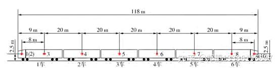 列车为6节编组,每节车厢内均布置了空气压力变化幅值测点,共计10个,测点位置如图2所示。为保证司机室内压力测试数据的有效性,每节司机室内部左右侧各布置一个测点。