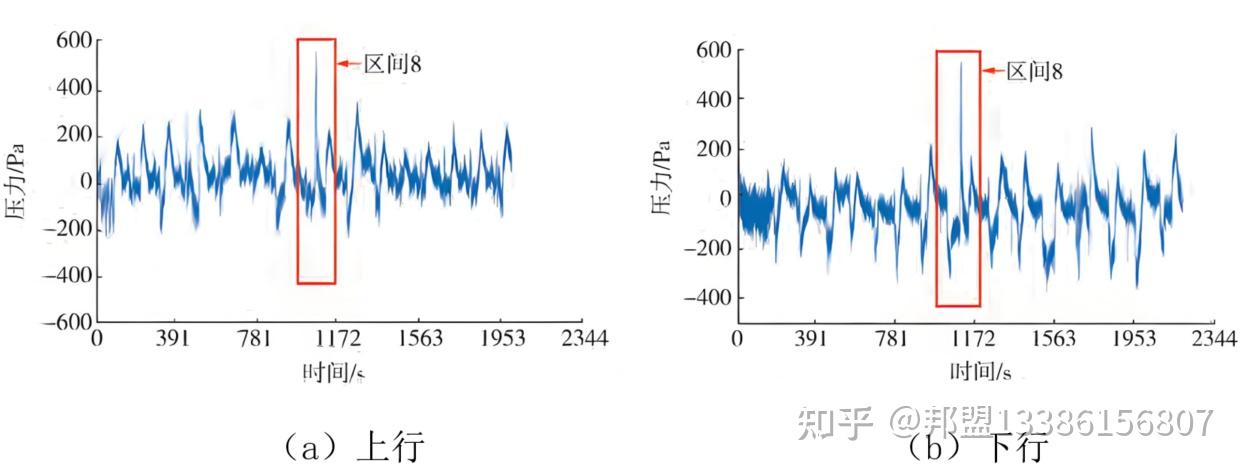 为重点关注列车上下行时司机室内压力的变化情况,取6车内测点10的压力数据进行分析。地铁列车以ATO模式在全线上下行时,测点10的压力变化曲线如图4所示。当列车上下行通过区间8,即中间风井位置区间时,司机室内压力产生了剧烈变化,压力变化正峰值明显增大。