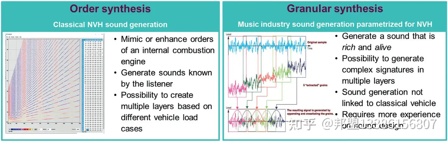 通过模拟内燃机阶次(如点火频率的谐波)生成声音,虽易被用户接受,但违背电动车“科技感”定位,且无法满足AVAS创新需求。 - 颗粒合成(Granular Synthesis)的崛起: