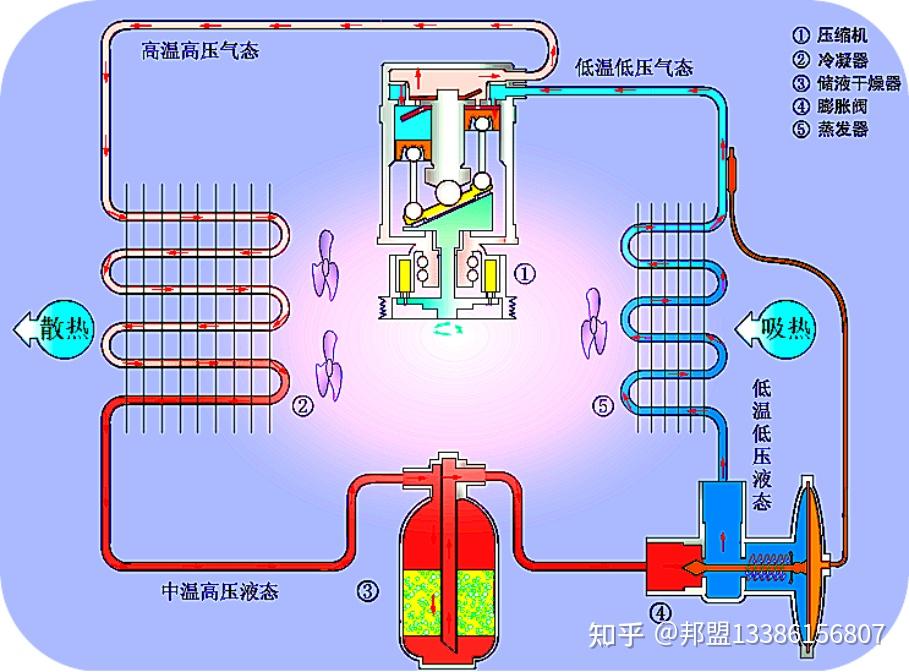 这一过程遵循热力学第二定律,通过压缩做功实现热量从车内向车外的转移,从而降低车内温度。