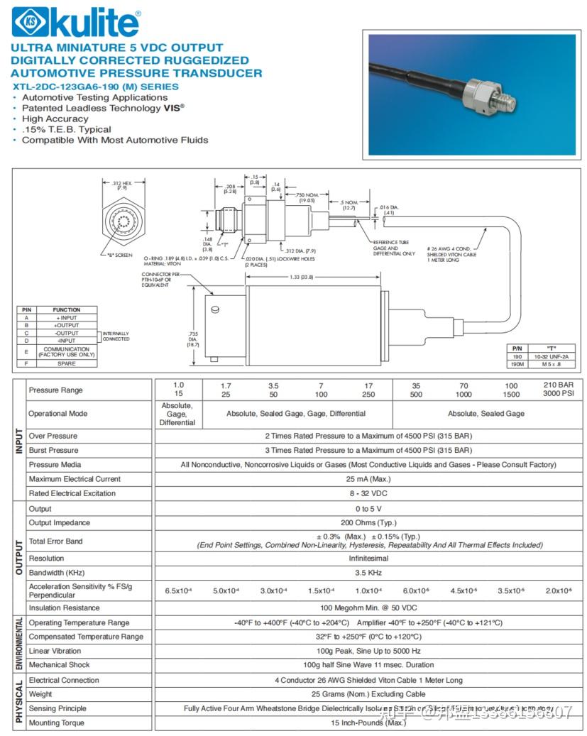 kulite压力传感器以其体积小、精度高、耐高温和加速度不敏感设计等优势,被广泛应用在变速箱研发过程中的油压测试。也是世界上仅有的可以放在变速内部测试传感器产品。XTL-2DC-123GA6-190-35BARSG和XTL-2DC-123GA6-190-70BARSG是两个常用量程型号。